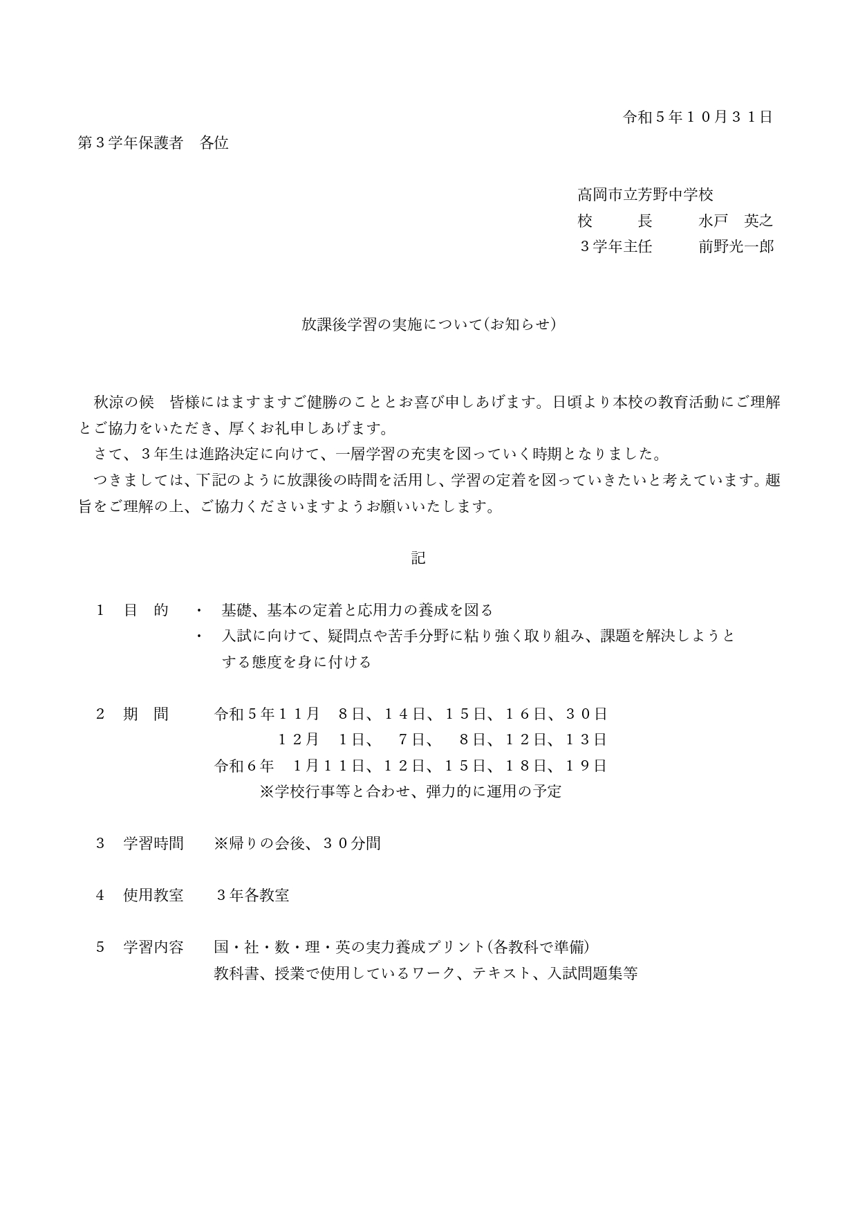3学年では、進路決定に向けて、より一層学習の充実を図ることを目的とし、11月に入ってから放課後学習を実施いたします。