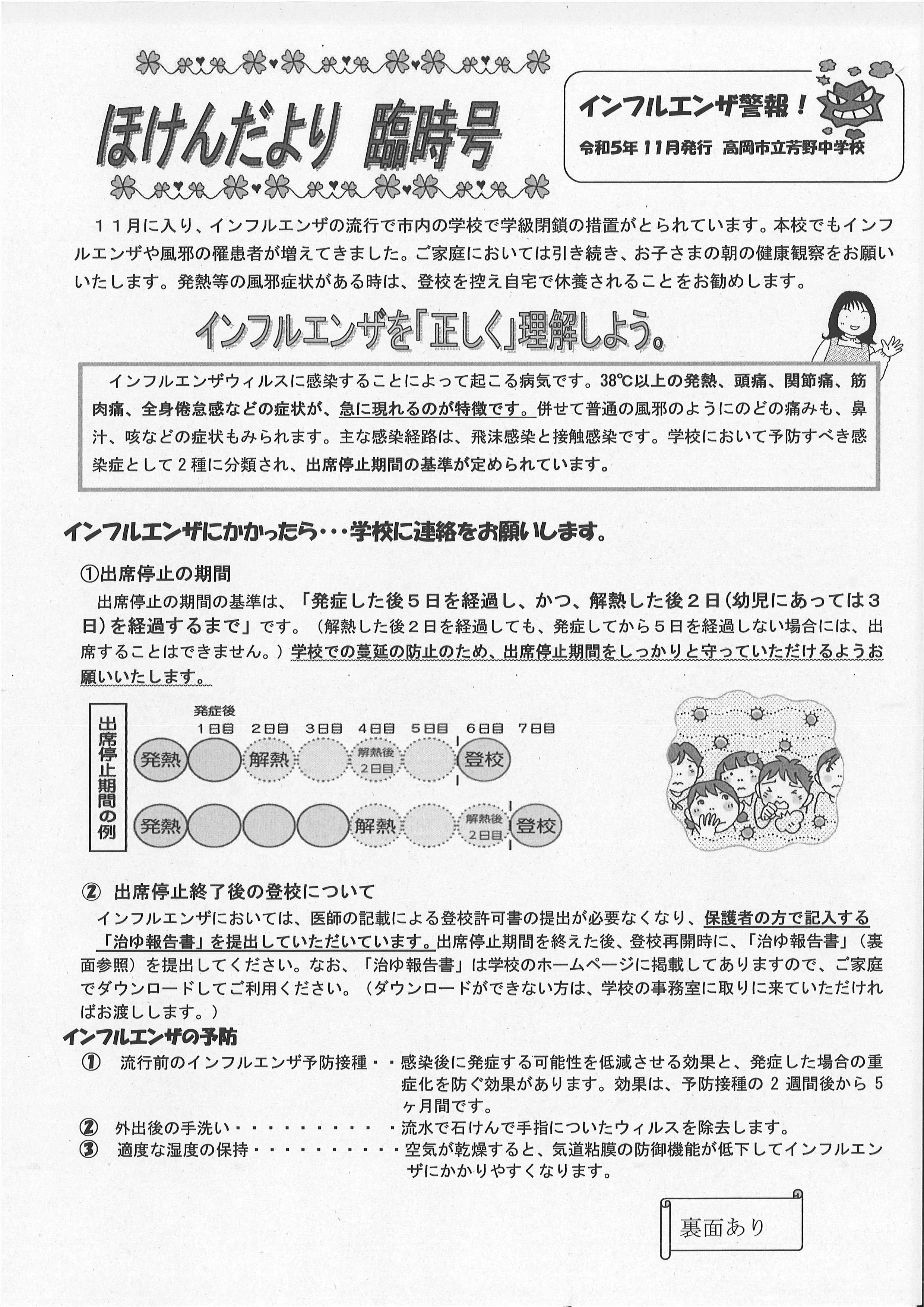 昨日ほけんだより臨時号を配布しました。インフルエンザについて特集してあります。ぜひご一読いただき、手洗い、うがい、十分な睡眠等でインフルエンザ予防に努めてください。