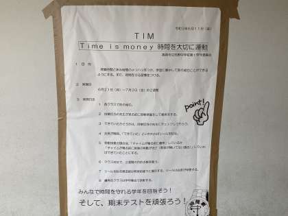 写真にあるように、1年生は「TIM運動」に取り組んできました。TIMとは、Time is money(時は金なり)の頭文字をとったものでしょう。今日、明日とラストスパート。全力を尽くしてください。