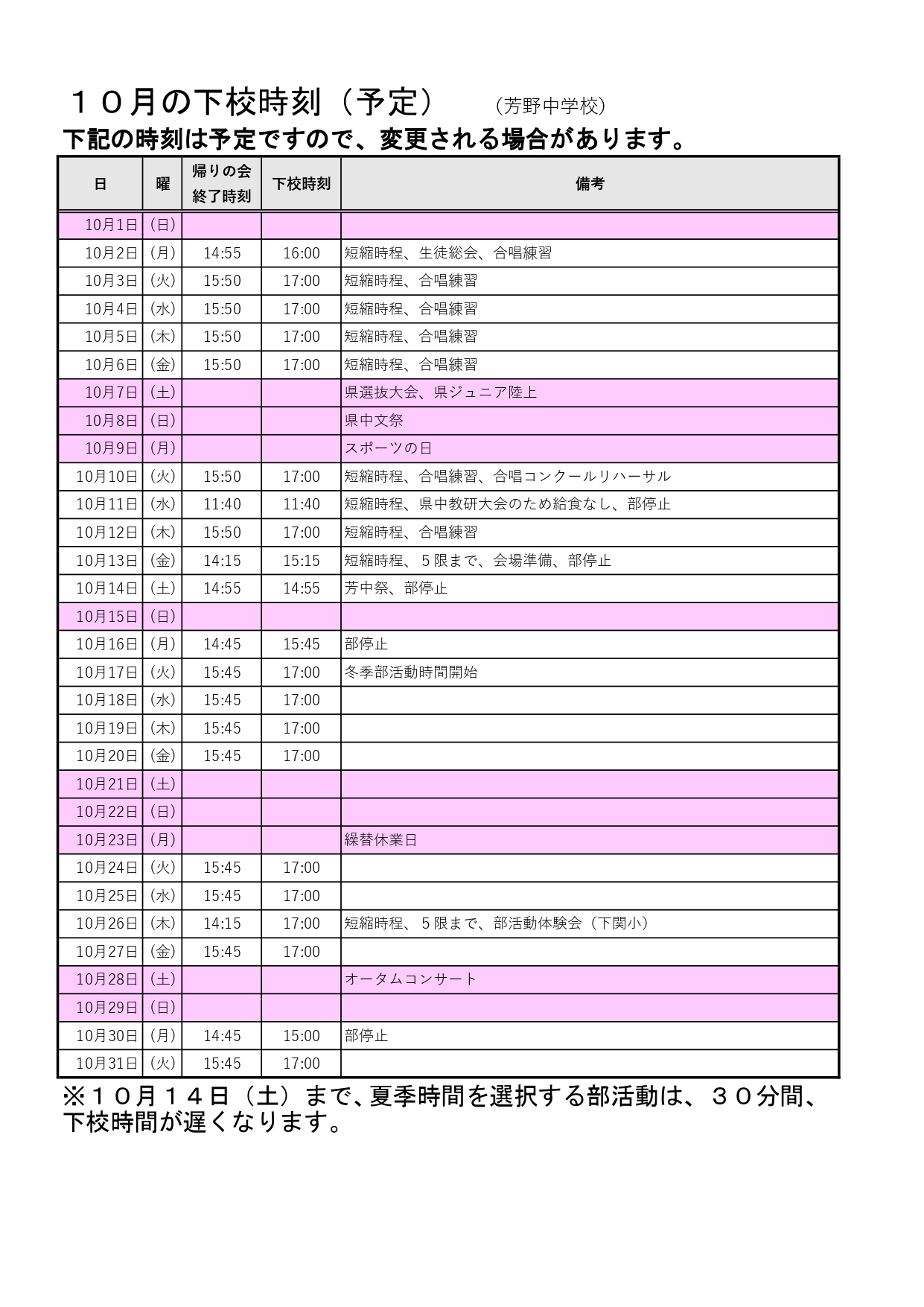 10月の下校予定時刻をお知らせします。ご確認ください。