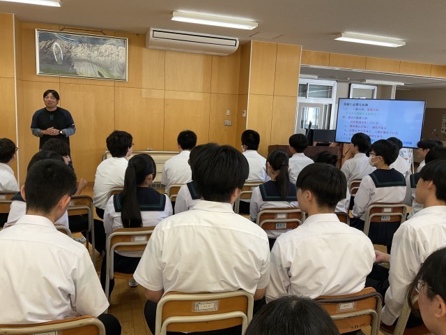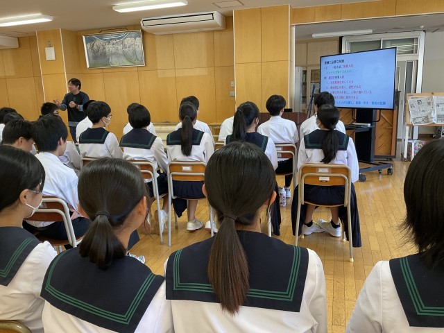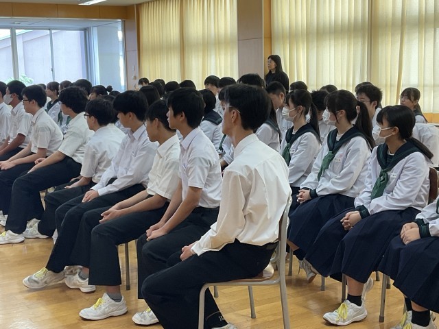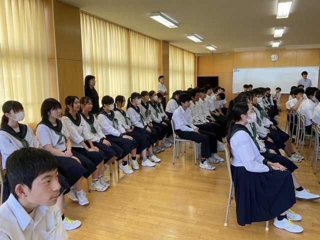3年生、未来に向けての第一歩 公開日 2025/10/05 更新日 2025/10/05 3学年 9月30日(火)3年生は高校入試に関する学年集会を行いました。集会では、高校入試の概要やスケジュールなどについて、学年主任の先生から詳しい説明がありました。生徒たちは真剣な表情で話を聞き、進路に向けての意識を高めるとともに、自分の目標に向かって努力しようとする様子が伺えました。生徒の進路実現に向けて、一人一人の希望に寄り添った支援を行っていきます。 +2