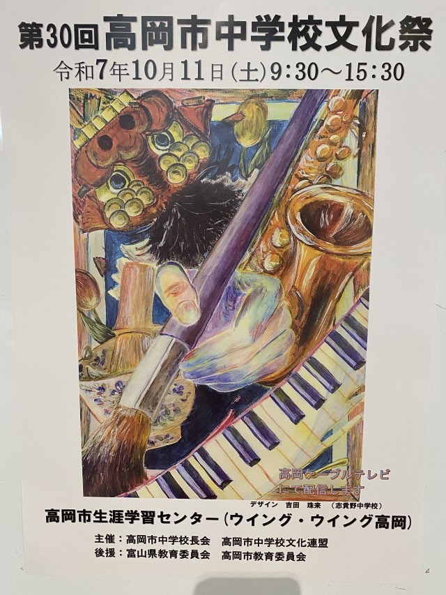 高岡市中学校文化祭 公開日 2025/10/13 更新日 2025/10/13 お知らせ 10月11日(土)高岡市中学校文化祭が盛大に開催されました。本校からは書道作品と美術部の生徒たちが参加し、日頃の創作活動の成果を発表する機会となりました。会場には、個性豊かな作品が並び、来場者の目を引いていました。美術部の生徒たちも、絵画や立体作品など、工夫を凝らした他校生徒の力作を鑑賞し、新たな刺激を受け、今後の活動への意欲を高めることができたようです。ご来場いただいた皆様、ありがとうございました。