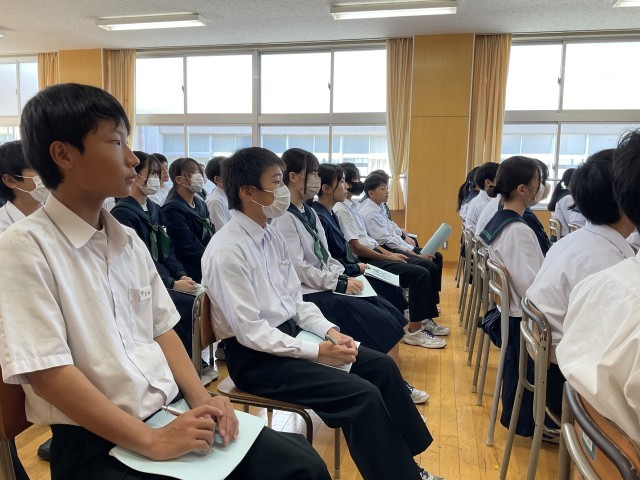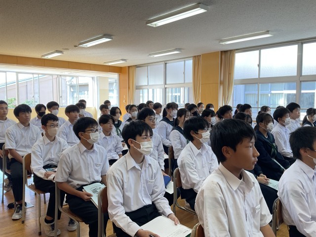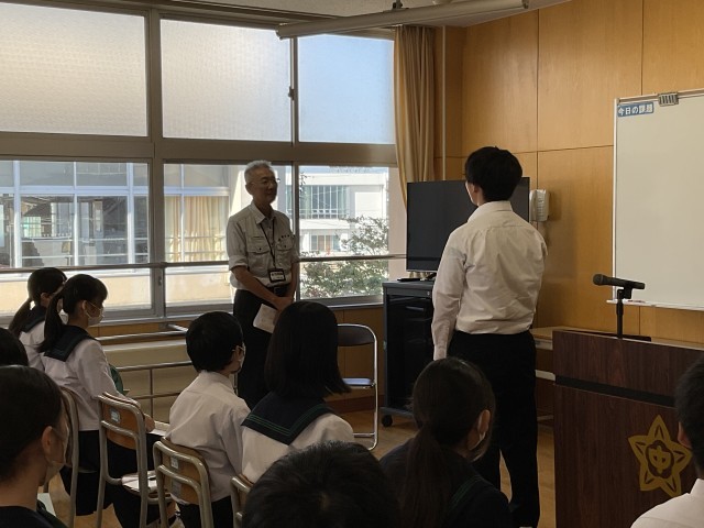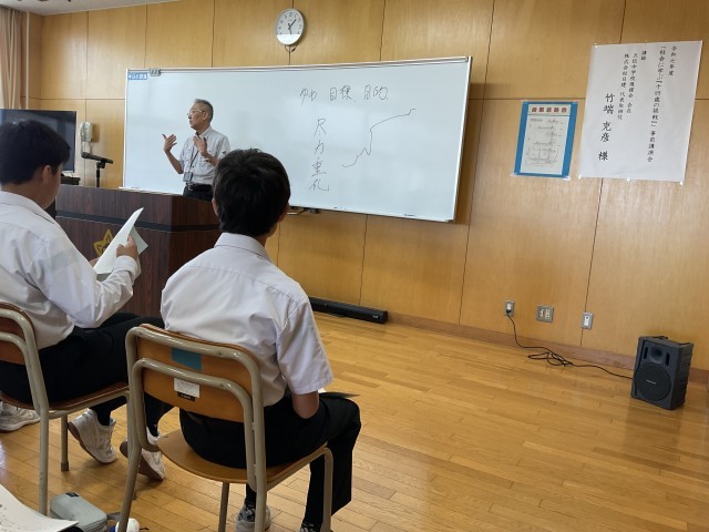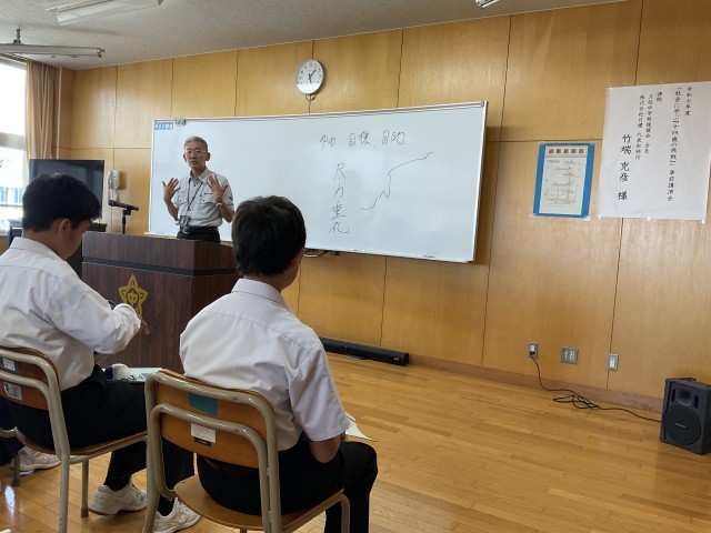 2年生では10月27日(月)~31日(金)の5日間、「14歳の挑戦」を実施します。今日は事前講演として、株式会社日建 代表取締役の竹端 克彦(たけはた かつひこ)氏を講師にお迎えしました。竹端氏からは、働くことの本質や心構えについて、温かく、そして力強いメッセージをいただきました。特に印象的だったのは、「尽力重礼(じんりょくじゅうれい)」という言葉です。これは「力を尽くして、礼を重んじる」という意味で、仕事に真摯に向き合い、相手への敬意を忘れない姿勢の大切さを教えてくださいました。また、竹端氏は「働くということは、人のために役立つこと、喜ばせること。悲しむ人がいたら、それは働いたことにはならない」と語り、仕事とは単なる作業ではなく、人とのつながりの中で価値を生み出す行為であることを、生徒たちに分かりやすく伝えてくださいました。生徒たちは、竹端氏の言葉に真剣に耳を傾け、自分たちがこれから体験する「14歳の挑戦」に向けて、働くことの意味を深く考える貴重な時間となりました。