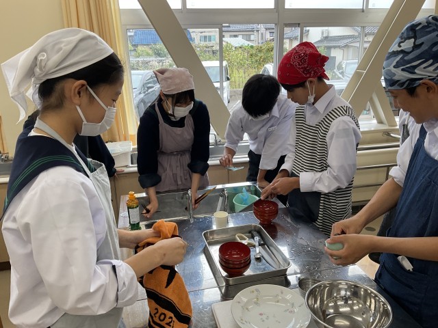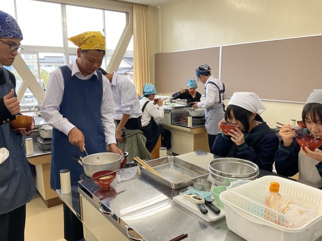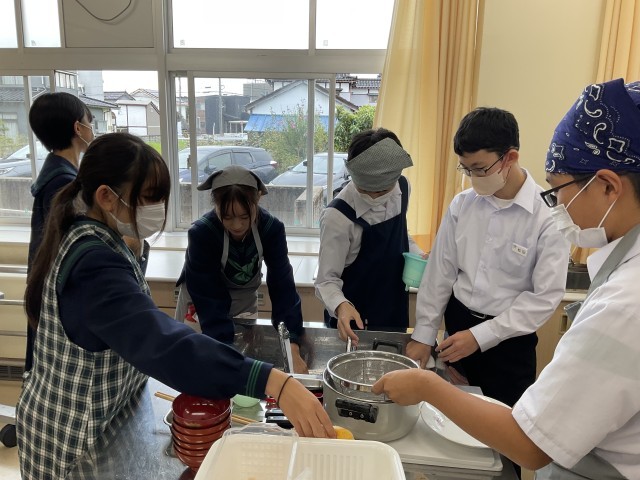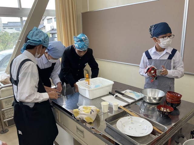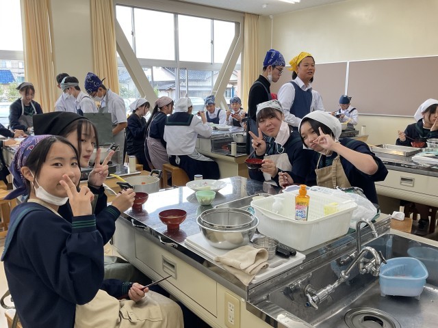 おいしくできました!~調理実習の様子~ 公開日 2025/10/21 更新日 2025/10/21 2学年 今日は2年生が家庭科の授業で調理実習を行い、「具だくさんみそ汁」づくりに挑戦しました。この実習では、野菜の切り方や煮込むタイミングなど班ごとに工夫して調理をしました。生徒たちは班ごとに協力しながら、にんじん、大根、ごぼう、ねぎなど、たっぷりの具材を使ったみそ汁を丁寧に仕上げました。自分たちで作ったみそ汁は格別だったようで、とても満足気でした。 +3