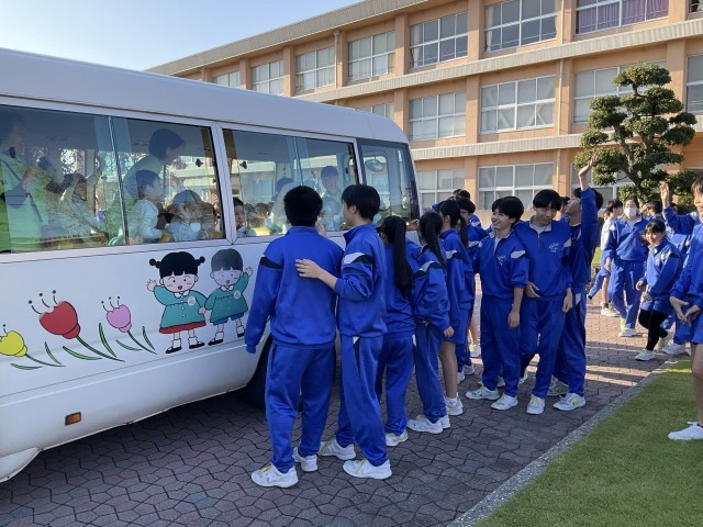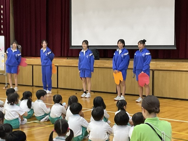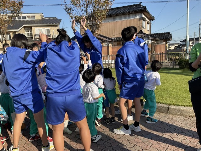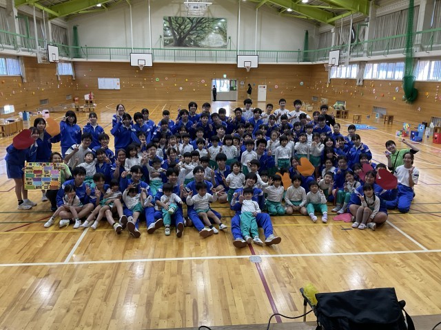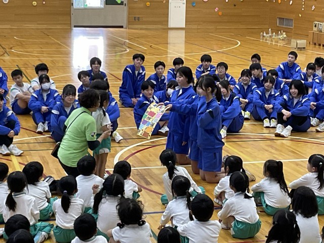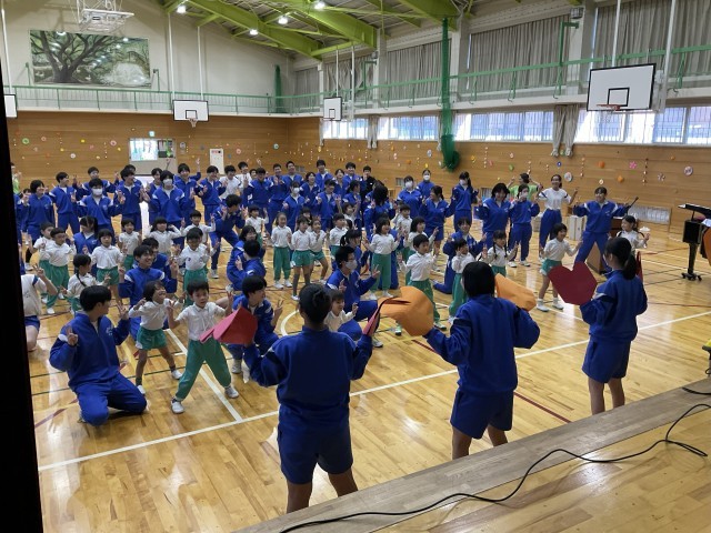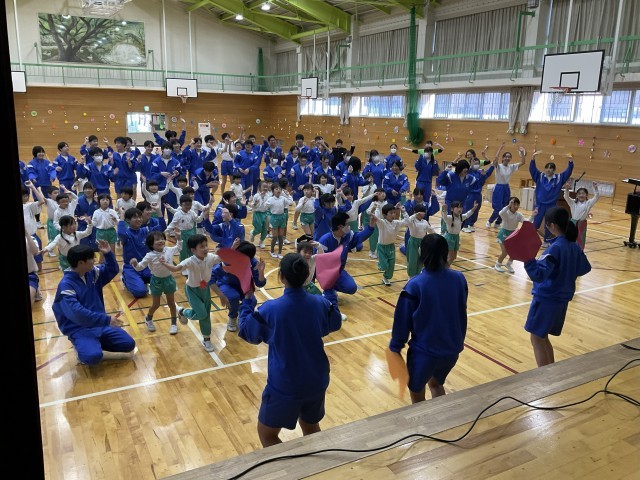 にこにこキッズパーティ(その3) 公開日 2025/10/31 更新日 2025/10/31 3学年 そして最後は、みんなで「エビカニクス」をダンス!音楽に合わせて体を動かし、会場は一体感に包まれました。園児たちの元気な踊りに、中学生も自然と笑顔になり、楽しい時間はあっという間に過ぎていきました。最後のお見送りまで、元気いっぱいの園児にパワーをもらいました! +5