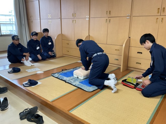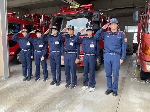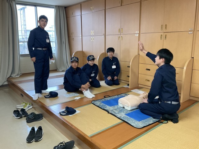 消防署では、救急救命の訓練をしていました。午前中は保育所の避難訓練に立ち会ったそうです。制服姿が様になってますね!!