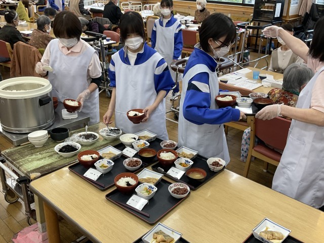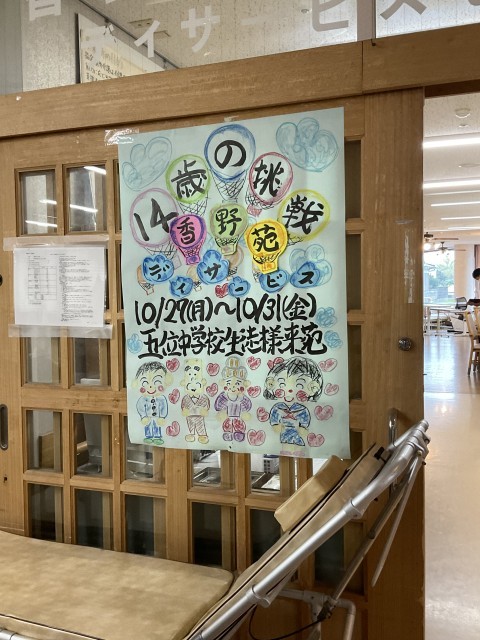 香野苑では、デイサービスを利用する方々に昼食の配膳をしていて、とても忙しそうでした。歓迎のポスターも作っていただいたようで感激ですね。