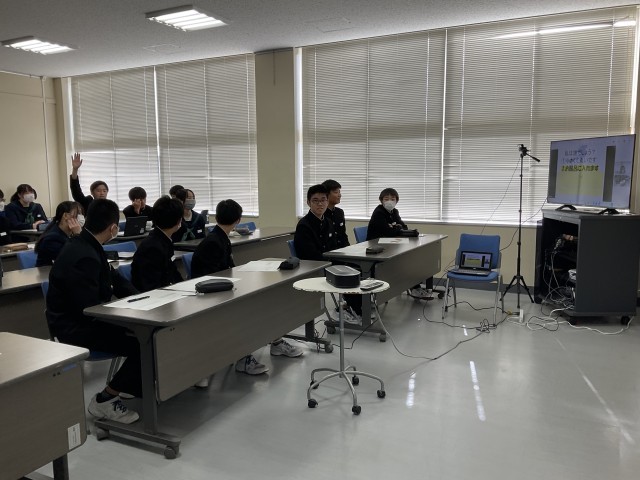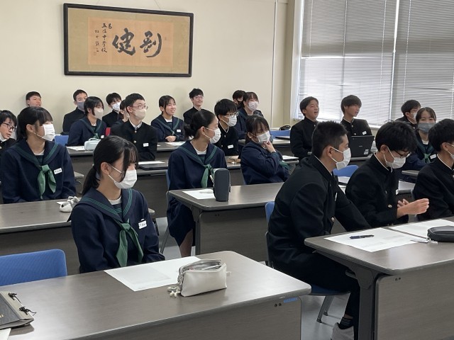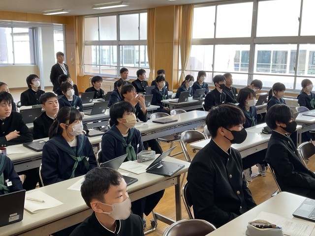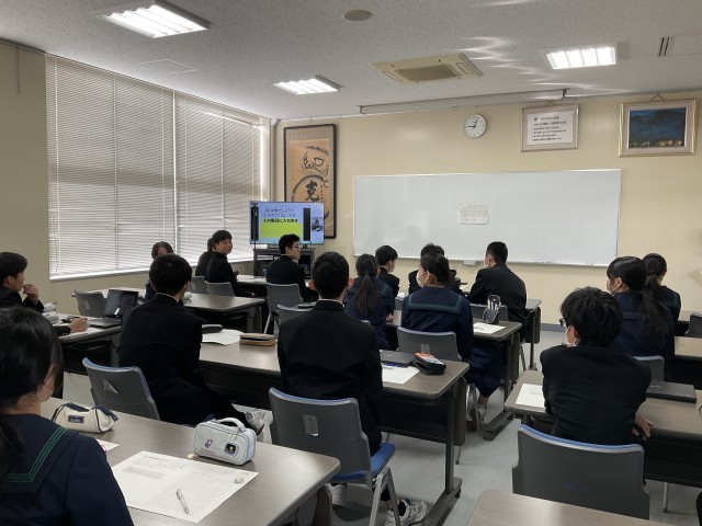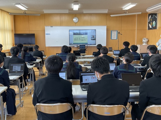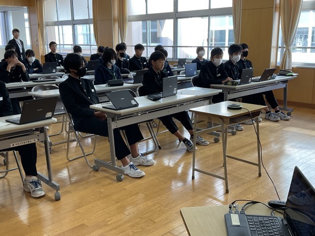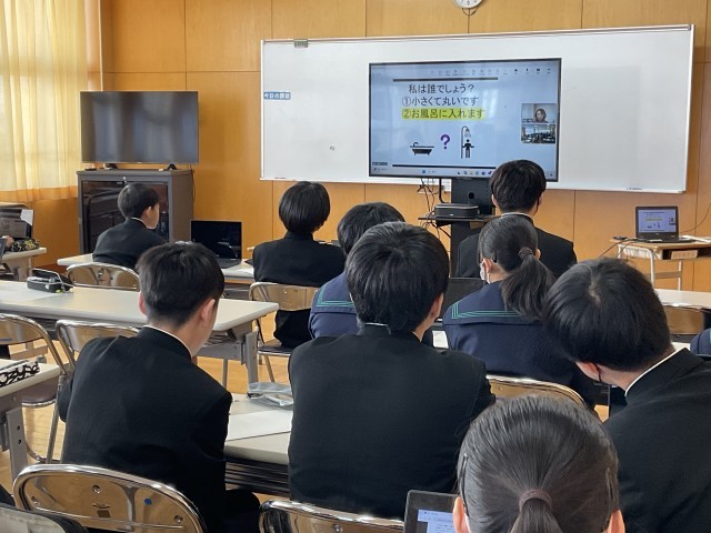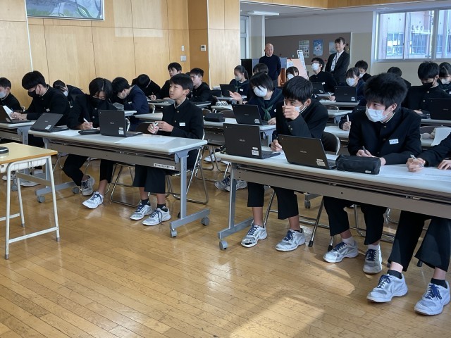 本日より2年生を対象に「論理コミュニケーション」の授業が始まりました。この授業は、遠隔地の慶應義塾大学SFC研究所の先生から講義を受ける同時双方向型のオンライン授業です。高岡市内の全中学生が2年次に授業を受けることになっており、今年で5年目です。生徒は、筋道を立てて考え、文章で表現する力を身に付けることで、論理的思考力と表現力を高めていくことを目的としています。今日は、モニターを通して、お世話になる先生との初対面となりました。