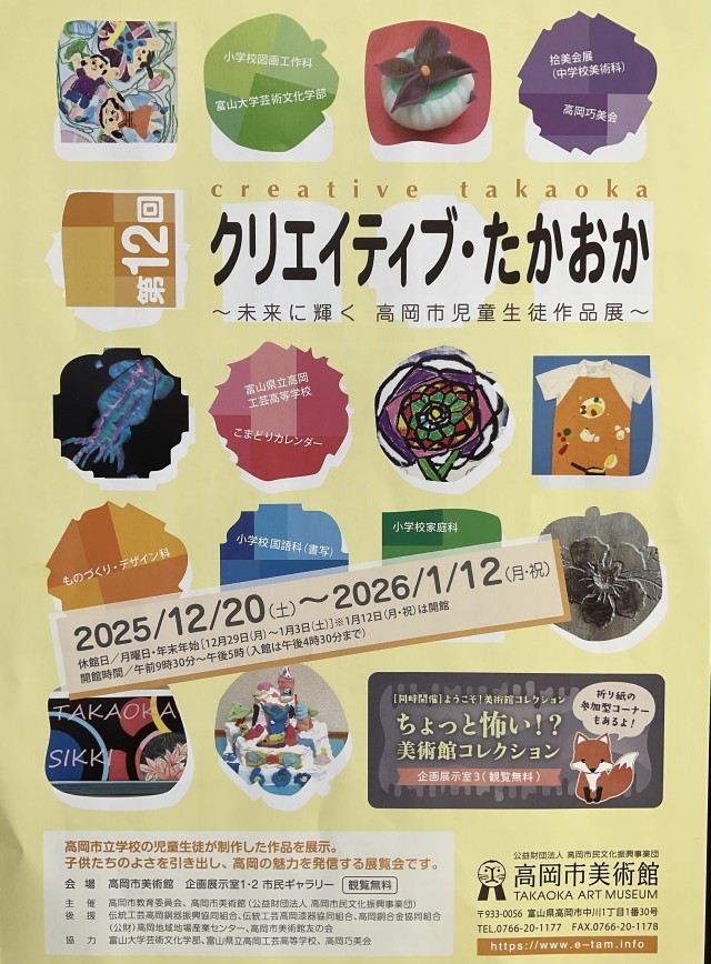 高岡市児童生徒作品展「クリエイティブ・たかおか」 公開日 2025/12/19 更新日 2025/12/19 お知らせ 12月20日(土)~1月12日(月・祝)の期間、高岡市美術館に於いて「クリエイティブ・たかおか」が開催されます。高岡市内の小中学生が制作した美術科、ものづくりデザイン科等の作品展です。その他、高岡工芸高校、富大芸術文化学部、中学校美術科教員の作品も展示されています。本校からは19名の生徒作品が出品されています。この機会にぜひ足をお運びください。