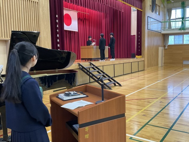 本日、2学期の終業式を行いました。体育館には、2学期を振り返る生徒たちの引き締まった表情が並びました。式では、校長先生から「努力と挑戦」をテーマに、合唱コンクールや地区新人大会、14歳の挑戦など、仲間と力を合わせて取り組んだ経験の大切さについて話がありました。また、式に先立って、2学期に活躍した生徒の受賞報告や、生徒会企画「五位中レクリエーション」で優勝したチームの表彰がありました。3学期も、さらに前向きな気持ちで新しい挑戦に取り組んでいきましょう。皆様、よい新年をお迎えください。