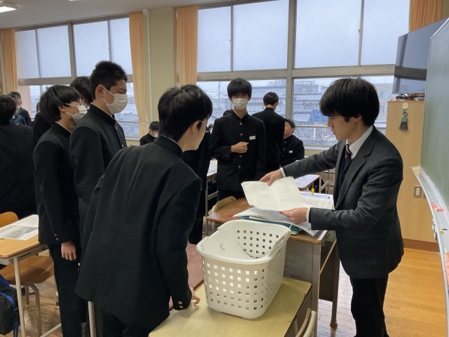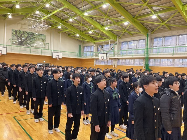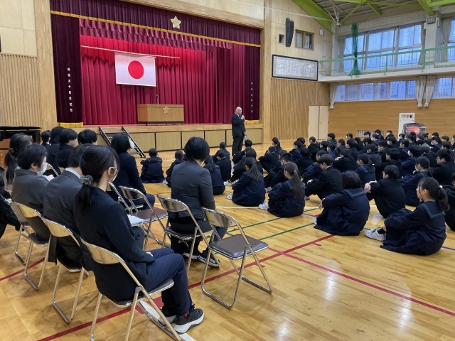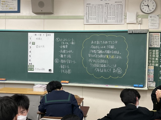 3学期スタート!「始業式」 公開日 2026/01/08 更新日 2026/01/08 学校行事 1月8日(木)、始業式を行い、3学期がスタートしました。各クラスでは、生徒たちが担任の先生のお話を真剣な表情で話を聞き、気持ちを新たにしていました。3学期は1年間のまとめの学期です。学習や生活の目標をしっかりと立て、充実した学校生活を送っていきましょう。 +5