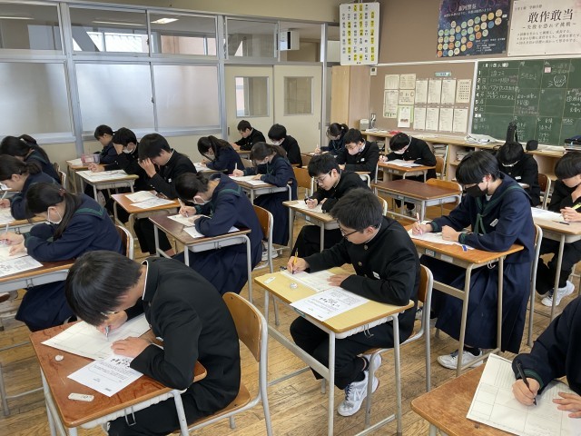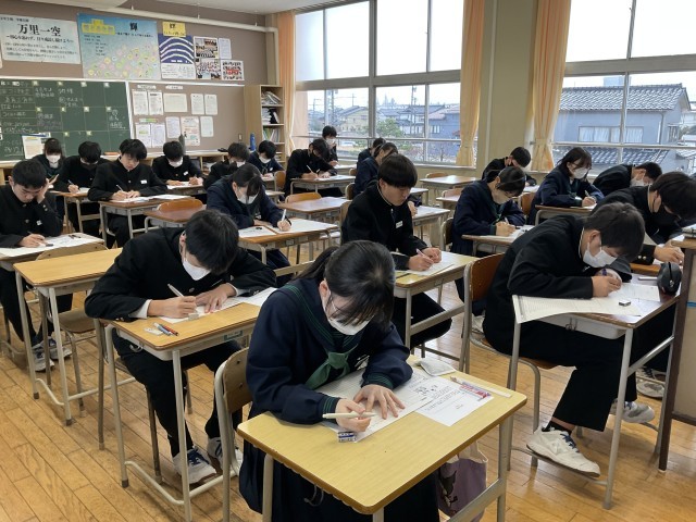 2年生「論理コミュニケーション検定」に挑戦! 公開日 2026/01/14 更新日 2026/01/14 2学年 本日2年生は「論理コミュニケーション検定」に臨みました。「高岡市に、これがあったらよいな」と思うものについて、自分の経験や見たことを根拠に600字で意見を論述しました。論理的に考え、相手にわかりやすく伝える力は、これからの社会でますます求められるスキルです。今回の検定を通して、自分の考えを整理し、筋道立てて表現する力をさらに伸ばしてほしいと思います。 +2