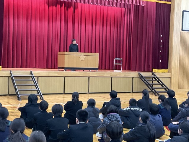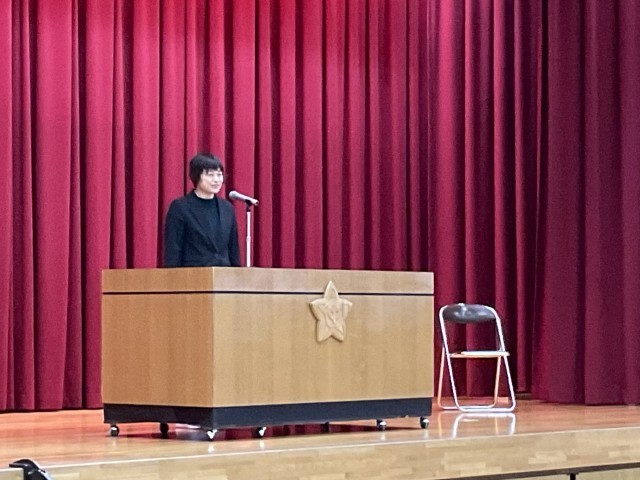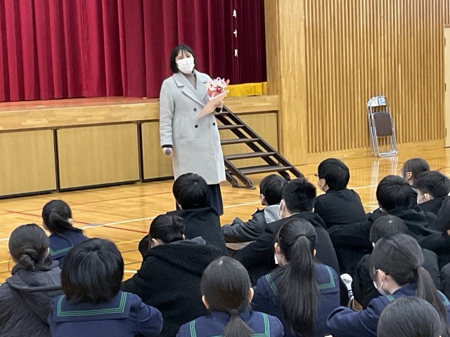 本日、英語科の古市先生の代員として着任された藤田先生の着任式を行いました。校長先生より紹介があり、生徒たちは新しく迎える先生のお話に、真剣な表情で耳を傾けていました。また、明日から産休に入られる古市先生とのお別れ会もあわせて行われました。古市先生は、これまで本校の英語教育において、生徒の学びを温かく支えてこられました。お別れ会では、2年生の生徒から感謝の言葉とメッセージカードや花束が贈られました。古市先生から生徒の皆さんへは、これからの成長を願う心のこもったメッセージが伝えられました。会場は感謝と応援の気持ちに包まれた温かな雰囲気となりました。