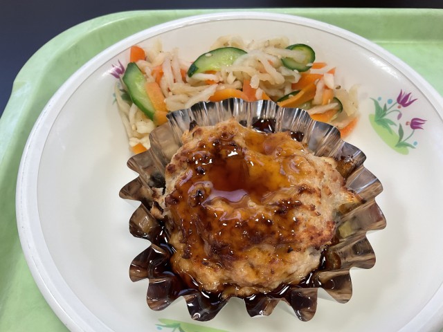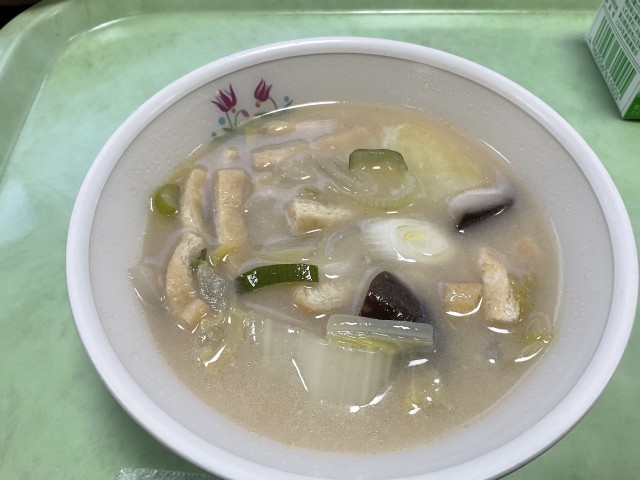 今日の献立のテーマは、SDGsの目標12「つくる責任、つかう責任」です。今日の「和風ミートローフ」には、大豆の加工食品をつくる際に捨てられてしまうことが多い「おから」、「酒かす汁」には椎茸の軸、「切り干し大根のごま酢和え」にはよく洗った皮付きに人参が使われています。日々の食品ロスについて考えながらいただきました。