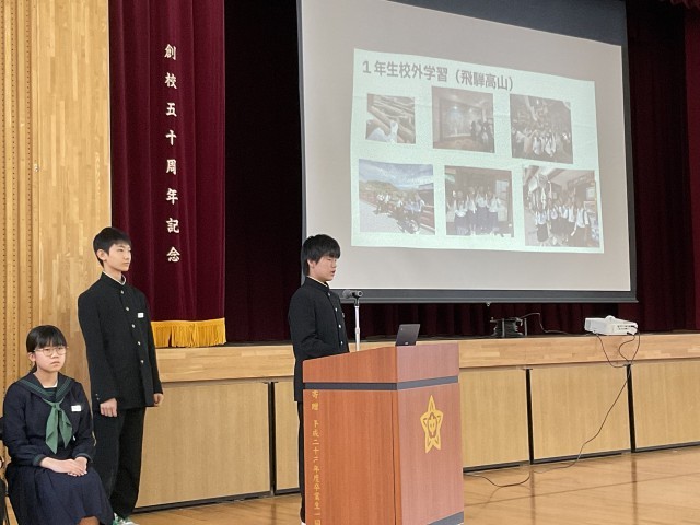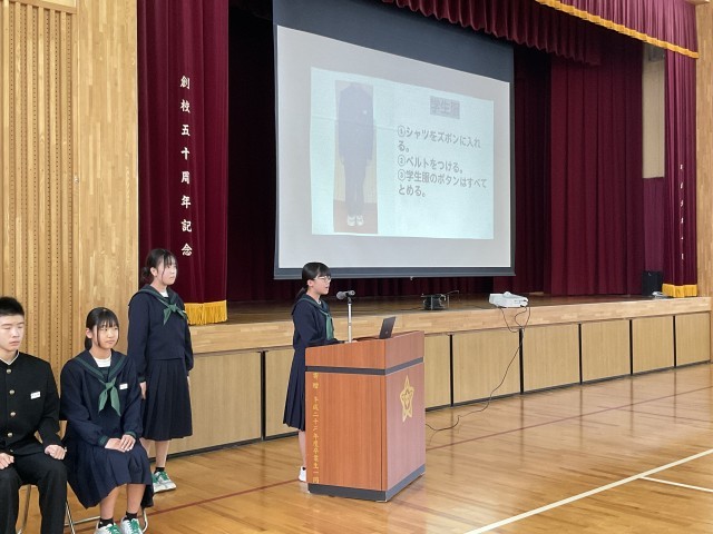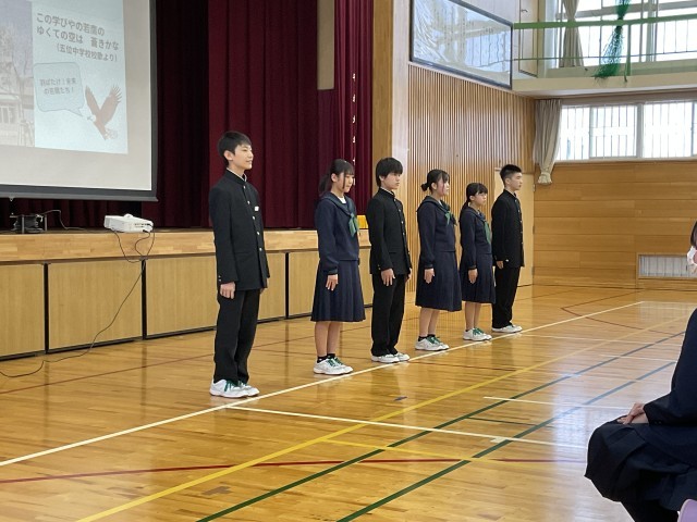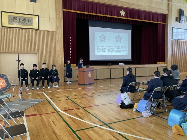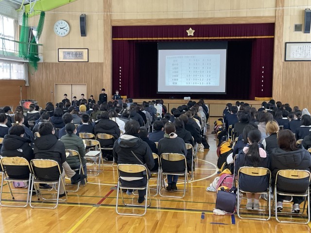 ようこそ五位中へ!~新入生説明会~ 公開日 2026/02/13 更新日 2026/02/13 学校行事 本日、五位小学校6年生を迎え、新入生説明会を行いました。保護者の方々も参加し、児童は中学校の授業の様子を参観しました。体育館では、中学1年生の代表生徒が学校生活の様子や部活動、行事について、写真を交えながら分かりやすく紹介しました。6年生は真剣な表情で話を聞き、中学校生活への期待をふくらませている様子でした。4月の入学式を楽しみにしています。 +6