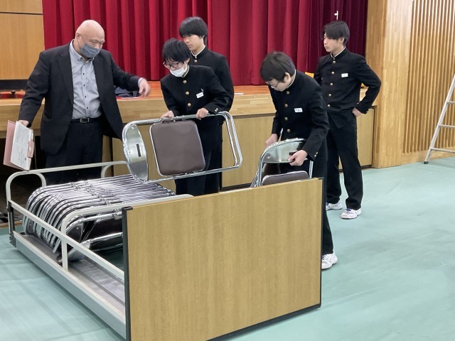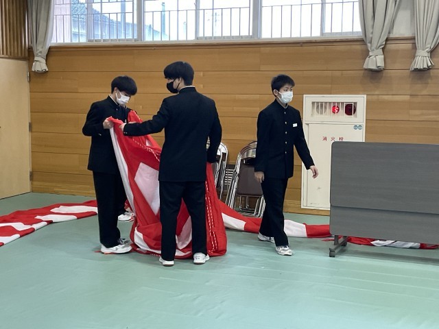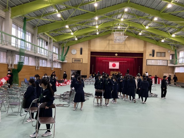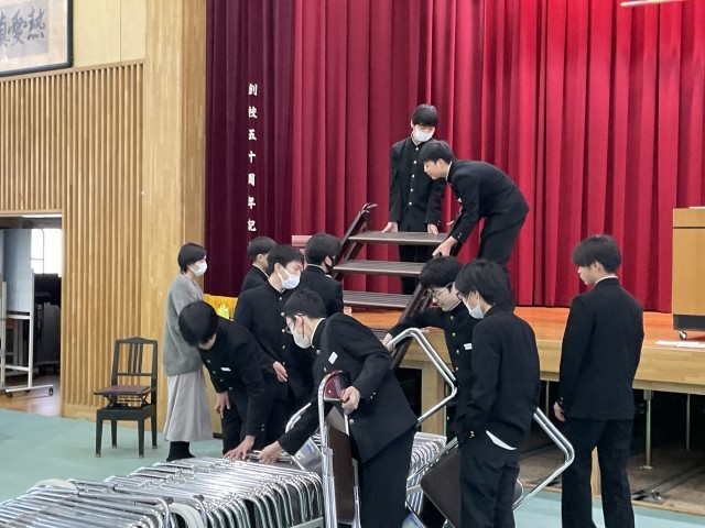 県立高校入試にチャレンジしていた3年生、本当にお疲れさまでした。今日は、2年生が中心となって卒業式の式場準備を行いました。3年生の晴れ舞台を心を込めて支えようと、椅子並べ、紅白幕の設置、装飾の配置など、それぞれが役割を確認しながら手際よく作業を進めました。2年生にとっては、来年度の最上級生としての自覚が芽生える、よい学びの機会にもなりました。心を込めて準備した会場で、3年生が素晴らしい門出の日を迎えられることを願っています。