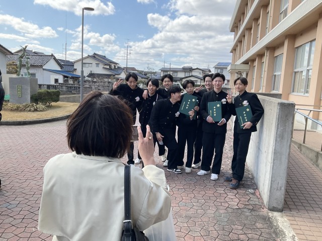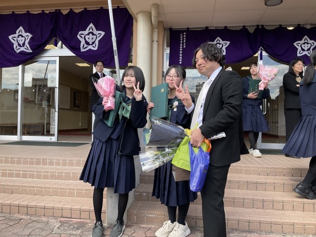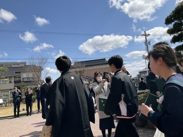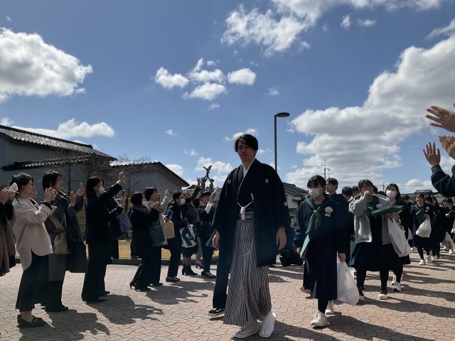 卒業式後、正門前では恒例の「門送り」が行われました。晴れやかな表情の卒業生がゆっくりと校門へ向かって歩くと、在校生や保護者、教職員が両側に並び、温かい拍手でその門出を祝いました。「おめでとう!」「頑張ってね!」といった励ましの言葉が次々に飛び交い、卒業生は笑顔で手を振ったり、時折立ち止まって仲間と抱き合ったりしながら、中学校生活最後のひとときをかみしめていました。春風の中、3年間の思い出と支えてくれた人への感謝を胸に、一歩一歩、次のステージへ踏み出す門送りとなりました。卒業生のみなさんの未来に、たくさんの幸せが訪れますように。