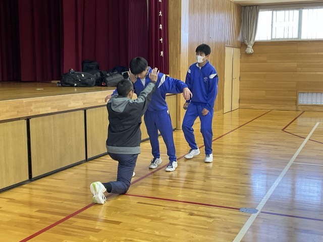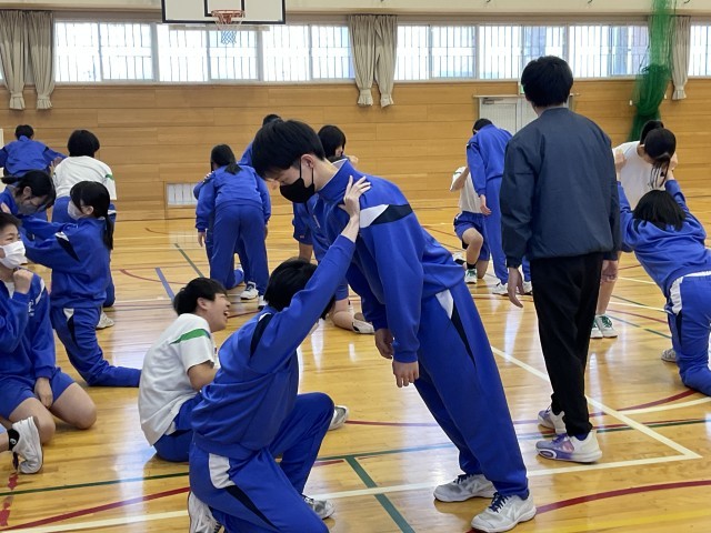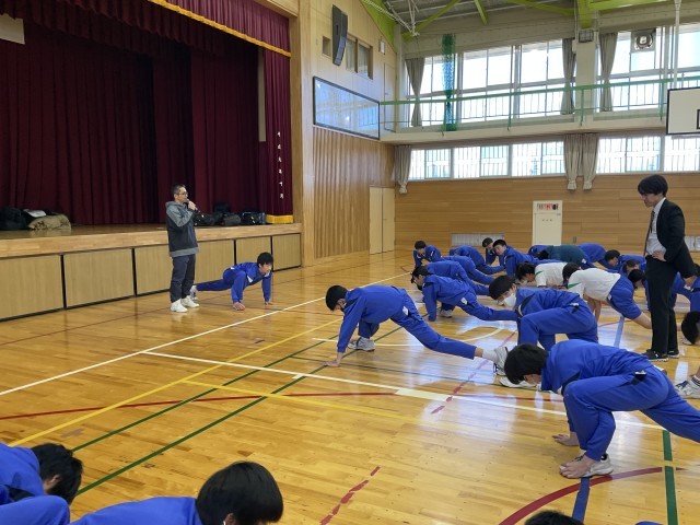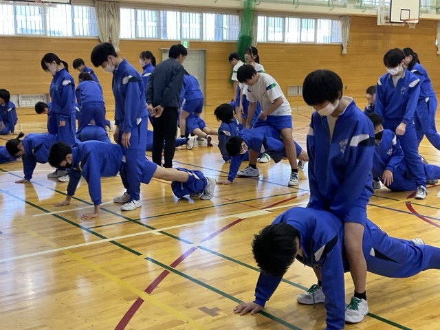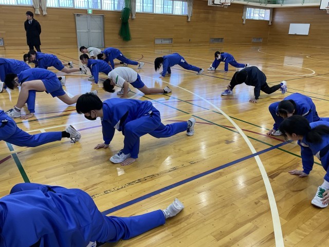 本日、保体委員会による部活動強化週間の一環として、合同トレーニングを行いました。本校陸上部エキスパートコーチの北浦さんを講師にお迎えし、専門的な視点からの指導を通して、体幹チェックや正しいストレッチ方法を教えていただきました。実演を交えながらわかりやすく指導していただきました。生徒たちは一つ一つの助言に真剣に耳を傾け、意識を高くもって取り組む姿が見られました。