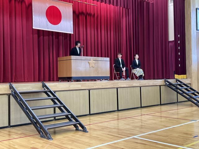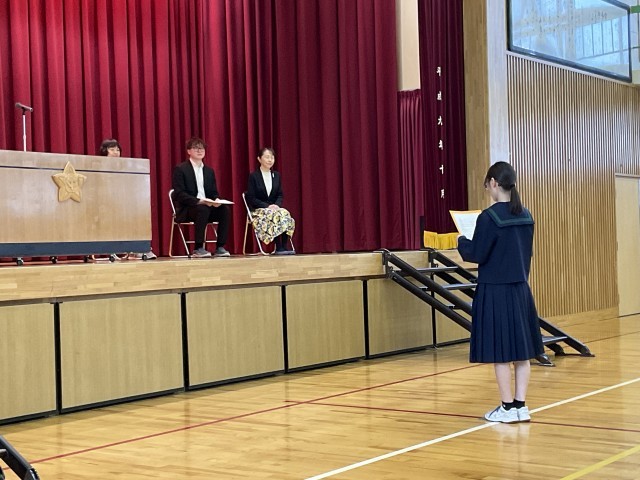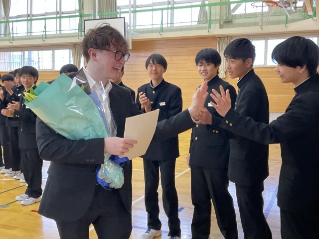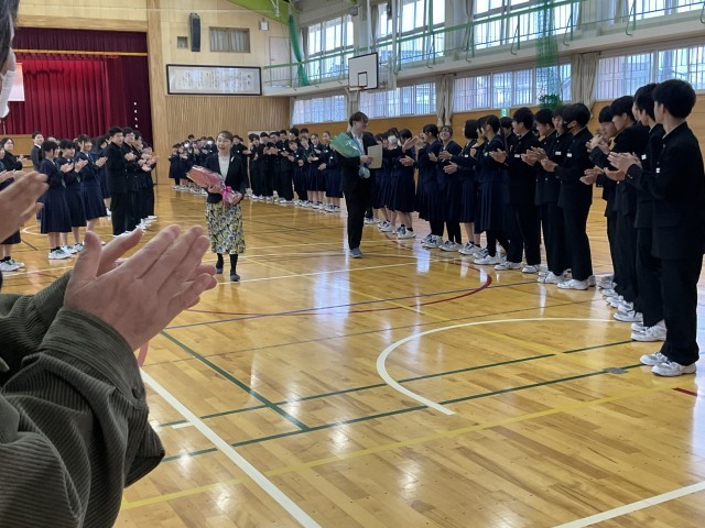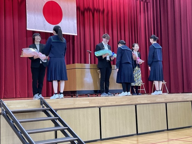 感謝の思いを込めて 〜離任式〜 公開日 2026/03/24 更新日 2026/03/24 学校行事 臨任講師(英語)の藤田先生、ALTのディラン先生、学校司書の本江先生の離任式を行いました。藤田先生は丁寧な英語指導で生徒の学びを支え、ディラン先生は明るい交流を通して英語の楽しさを伝えてくださいました。本江先生は読書環境を整え、生徒の学びを温かく見守ってくださいました。式では感謝の言葉と花束が贈られ、心温まる時間となりました。これまでのご尽力に心より感謝し、今後のご活躍をお祈りします。 +2