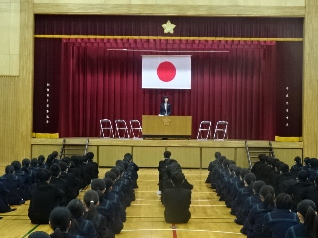 1学期始業式 公開日 2026/04/07 更新日 2026/04/07 お知らせ 新任式、そして令和8年度1学期の始業式がありました。校長先生からは、夢や希望、目標をもち、努力を積み重ねる1年にしてほしいという話がありました。「3年生という誇りをもって過ごしたい」「学習を頑張りたい」「部活動で結果を出したい」「何事にも挑戦する1年にしたい」等、決意を新たにしていました。