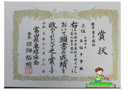 全国中学選抜卓球大会富山県予選 公開日 2021/12/20 更新日 2021/12/20 部活動 全国中学選抜卓球大会富山県予選が18日(土)に開催されました。五位中卓球部男子が、団体でみごと3位入賞です。 おめでとうごさいます!