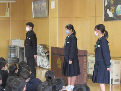 学年集会 公開日 2021/12/21 更新日 2021/12/21 1学年 今日は、冬季休業前の学年集会が、各学年で行われました。 写真は、1年生の学年集会の様子です。「社会科コンテスト」の表彰の後、クラスの代表が2学期の振り返りを大きな声で発表してくれました。
