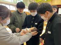 講師に、富山短期大学 准教授の吉牟田 裕先生をお迎えして福祉や介護について学ぶ出前講座が行われました。講座では、介護などご高齢の方とのかかわり方や介護の仕事についてのお話を聴いたり、介護ロボットの体験をしたりして、介護のお仕事の具体的な内容や魅力・資格等について教えていただきました。