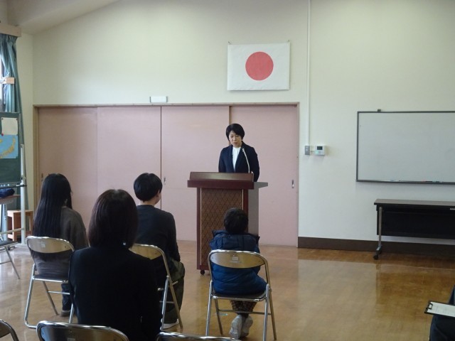 教育センター次長の式辞では、大成功だった先日のお楽しみ会を例に、「本番が成功したのは、『みんなの喜ぶ顔』を思い描いたしっかりとした準備があったからです。新しい年も目標を考え、それを達成したときの『自分の喜ぶ顔』を思い浮かべて準備を重ねていってください」との話がありました。