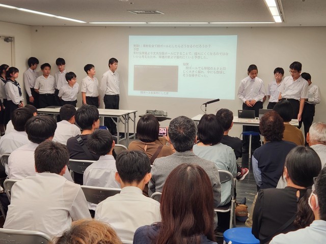 科学部門では、砺波市立出町中学校、高岡市立戸出中学校、立山町立雄山中学校、富山大学教育学部附属中学校が「錆」、「細菌」、「空気の力」、「波」等についての研究発表を行いました。