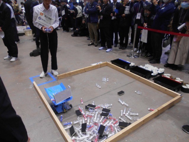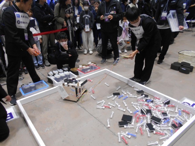今年は「『復活白エビ漁』~よみがえれ!!富山湾の宝石~」と題し、180秒間にコート内に散りばめられたアイテムをロボットで捕獲し、種類別ごとに選別し、籠に入れる競技です。生徒はロボットを工夫し、様々な方法で競技に挑みました。結果は以下の通りです。