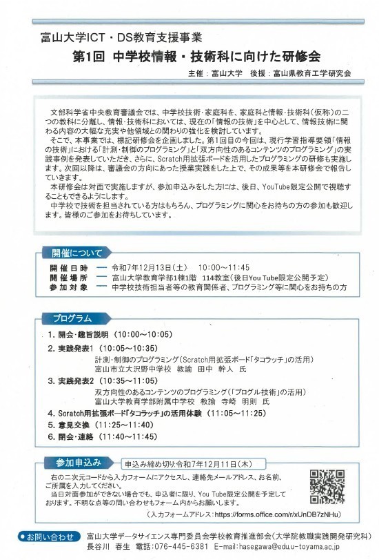 富山大学ICT・DS教育支援事業 第1回 中学校情報・技術科に向けた研修会