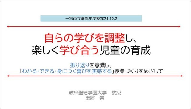 15時20分から16時まで講演。演題「自らの学びを調整し、楽しく学び合う児童の育成 振り返りを意識し、「わかる・できる・身につく喜びを実感する」授業づくりをめざして」と題して、40分間。まずは研究授業について動画を提示しながら、全員で共有化したいことを伝える。25分間ほど。残り15分間で午前に見たすべての授業について動画をもとに気づきを紹介。
