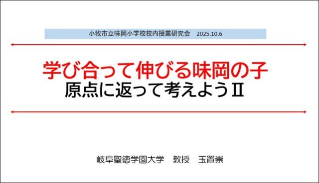 15時35分から16時35分まで講演。演題は「学び合って伸びる味岡の子 原点に返って考えようⅡ」。前回訪問で話した中から、最重要ポイントを動画を見せながら伝え、3つの特設授業、10の参観授業についても整理した動画を使って、共有化したい展開の仕方や技術を伝える。