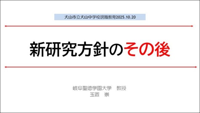13時40分から5限授業参観。全体協議会では、5つの部会のうち「課題設定部会」の話し合いを聞く。15時40分から16時5分まで講演。演題は「新研究方針のその後」としたが、実際は、次期学習指導要領の中核的概念の話が中心。優れた授業映像はごくわずか💦