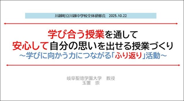 14時30分から事後研修会。先生方の話し合いは随時ネットにあげられ、僕はそれを見ながら動画整理。15時30分から16時10分まで僕の講演。演題は「学び合う授業を通して安心して自分の思いを出せる授業づくり~学びに向かう力につながる「ふり返り」活動~」。第1回訪問時のプレゼンを見せながら、この学校が目指していることを確認。次期学習指導要領資料を提示しながら単元を通して子どもを育てる意義を説明。その後、授業動画をもとに授業者から思いを聞きながら価値づけ。子ども一人一人のことをよく把握しておられるのも、指導案の生徒観から伺えたこと。やはり!という対話ができた。