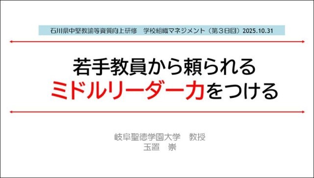 演題は「若手教員から頼られるミドルリーダー力をつける」。昨年に引き続いての依頼。とはいえ、ミドルリーダーの定義を実例をもとに増やしたり、次期学習指導要領のことに触れたりの2時間50分。途中10分間の休憩を入れたとはいえ、3時間弱はさすがに疲れる。ペアトーク、立ち上がってのグループトークも入れての動きのある3時間を構成したこともあって、最後までよく聞いていただき、大爆笑していただくこともあって(200人を超える方の一斉の笑いは気持ちがいい(笑))、満足していただいたと自負。