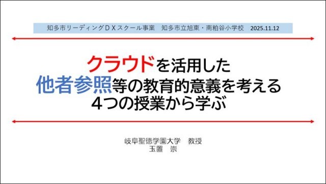15時10分から16時20分まで講演。演題は「クラウドを活用した他者参照等の教育的意義を考える 4つの授業から学ぶ」。始めに次期学習指導要領を視野に入れて「デジタル学習基盤」について説明し、知多市の整備状況のよさを確認。自立した学習者を育てる意義、ICT活用における全国的な問題点をもとに4つの授業での活用は申し分ないことを押さえる。思考の追随を紹介後に4つの授業動画を基に授業者とやりとりしながら、皆さんと共有化。最後は教師はファシリテーターであるべきを示す動画を見せて終了。ちなみにファシリテーターとは「会議や議論、ワークショップなどで、中立的な立場から議論を円滑に進め、参加者の意見を活性化させ、合意形成を支援する人。単なる司会進行役とは異なり、参加者の心情を汲み取りながら、話し合いをより良いゴールへ導くために深く関与する」。