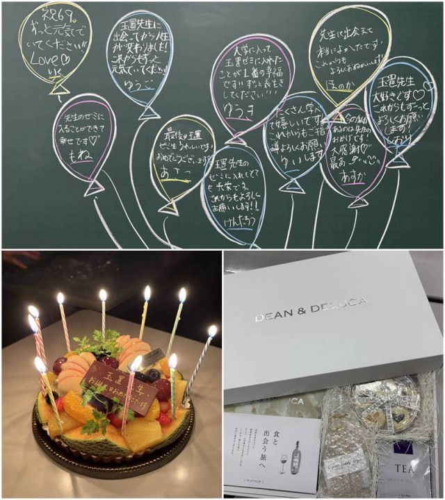 豪華な誕生日ケーキのろうそくを消して、改めて誕生日お祝いをしてもらう。黒板メッセージを読むだけでも心が揺さぶられる。卒業までの限られた時間、このゼミ生のために精一杯頑張ろうと心新たにする。