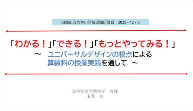 30分間で必死に動画整理。そして講演1時間。演題は「「わかる!」「できる!」「もっとやってみる!」~ ユニバーサルデザインの視点による算数科の授業実践を通して ~」。前回訪問時でのプレゼンで研究方針を確認後、今日の授業を導入、展開、終末の各重要共有ポイントを動画を見せながら伝える。コンパスの軌跡は一定距離の集合であることを押さえる場面での教師言を特に助言。先生方全体には、「思考の追随」「ファシリテーター」「聴き合う姿勢のレベルアップ」を提言。また、次年度に向けて研究の蓄積方法について助言。