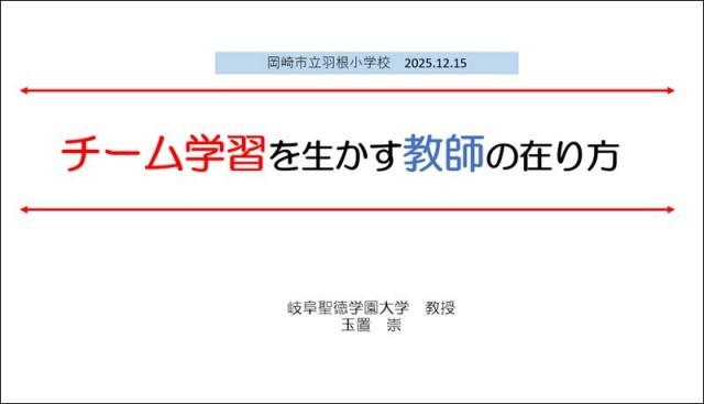 15時10分から1時間の講演「チーム学習を生かす教師の在り方」並びに指導助言。参観した全ての授業での子どもたちが落ち着いて先生の話をよく聞き(1年生でもしっかりできている)、活動したり、発言したり、書いたりしている。この状態なら、全国学力テストの平均点が高くなるはず。校長先生の意向を踏まえて、さらなるバージョンアップするための手立てを提案。後半は授業動画をもとに一言コメント。ただし、動画整理が追い付かず、中途半端になってしまったことが申し訳ない。
