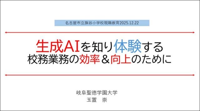 15時から45分間、「生成AIを知り体験する 校務業務の効率&向上のために」と題して講演。冒頭はnotebookLMを活用した概略、音声解説、インフォグラフィックを紹介。驚きの声を挙げられる皆さん。かつてのゼミ生からもらった実践例と生成AI活用にあたっての心得を紹介。一旦、会を締めて、その後は自由に活用体験。いくつかの質問(不都合)をいただく。多くの要因は保存ファイル形式違いやクラウド上データの加工は出来ないことなど、トラブルを生じさせていることがわかり、こちらが学ぶ。