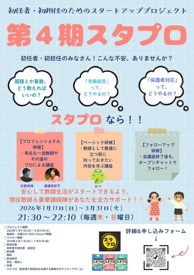 今年も初任者・初担任のためのスタートアッププロジェクトの案内をいただいた。いよいよ4月から教師人生をスタートする皆さんのためのオンライン講座です。お勧めです。