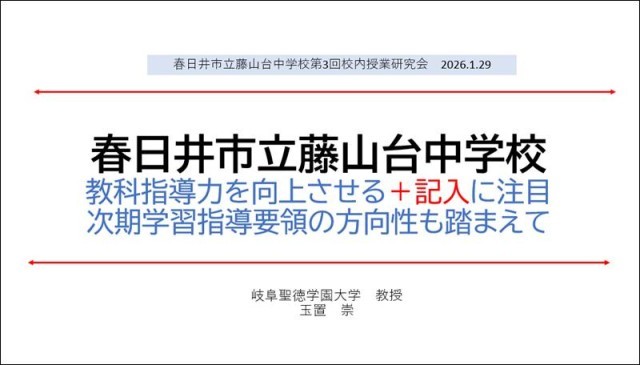 休憩時間を使って必死に動画整理。15時15分から16時まで講演。演題は「教科指導力を向上させる+記入に注目 次期学習指導要領も踏まえて」。藤山台中指導案の特徴の一つ、「+記入」の価値を伝え、これが次期学習指導要領で検討されている「タテ・ヨコの関係」に強く関連していることを伝える。その後、各授業ごとに動画を見せて、時に授業者とやりとり。最後は校長先生に「なぜ、このように授業文化が受け継がれているか」をインタビュー。やはり仕掛けがあってのこと。マネジメントの成果!