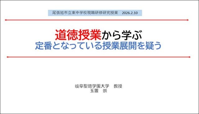 尾張旭市立東中学校へ向かう。9時40分からの3年生道徳授業参観。すぐに授業者や教務主任らと授業の振り返り。僕からは、学級経営の積み上げの成果がよく表れていることを伝えた後、子どもたちが自由に発言でき、「道徳授業では納得解を得ることが大切であること、授業者はその姿勢であること」も評価。題材解釈については、僕の見解を伝える。この題材で主人公の行動の賛否をとるのはどうかと伝える。そのための自分の教材ととらえ方を伝える。その他、若干の授業技術の伝達。題して「定番となっている道徳授業展開を疑う」。