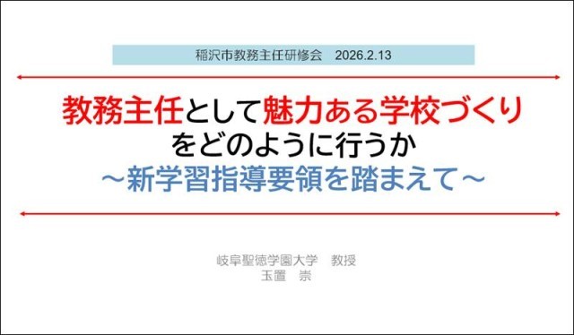 14時30分から16時まで、稲沢市小中学校教務主任研修会講演。演題は「教務主任として魅力ある学校づくりをどのように行うか ~新学習指導要領を踏まえて~」。今回は次期学習指導要領の審議内容を伝えながら、学校で教職員にどのように伝えたらよいかを重点にして話す。皆さんの頷きが徐々に多くなることを見ながらの90分間。