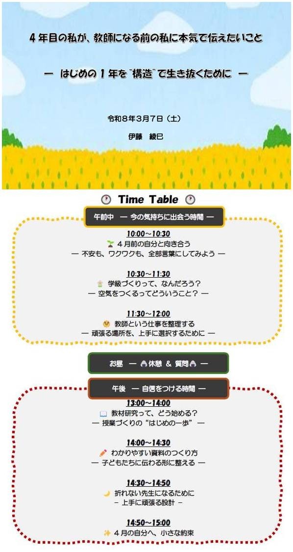 8時54分地元駅乗車、9時44分名古屋駅着。レンタルルームへ。10時から14時30分まで、ほぼ休憩なしで、学生の勉強会に付き合う。この企画は4月からの教員スタートが不安でいっぱいで、学級づくりと授業づくりの超基本でよいので学びたいというゼミ生らの要望を受けて開催。過去のゼミ生から伊藤綾巳さんに講師をお願い。喜んで引き受けてくれた。そして、かなりの時間をかけて資料「4年目の私が、教師になる前の私に本気で伝えたいこと ―はじめの1年を“構造”で生き抜くために―」も作って臨んでくれた。タイムスケジュールを見てもらうとよくわかると思うが、3年間の教師生活を意図的に送ってきた証が伺える質の高いさすがの資料!この企画は定番にしたいほどの内容。