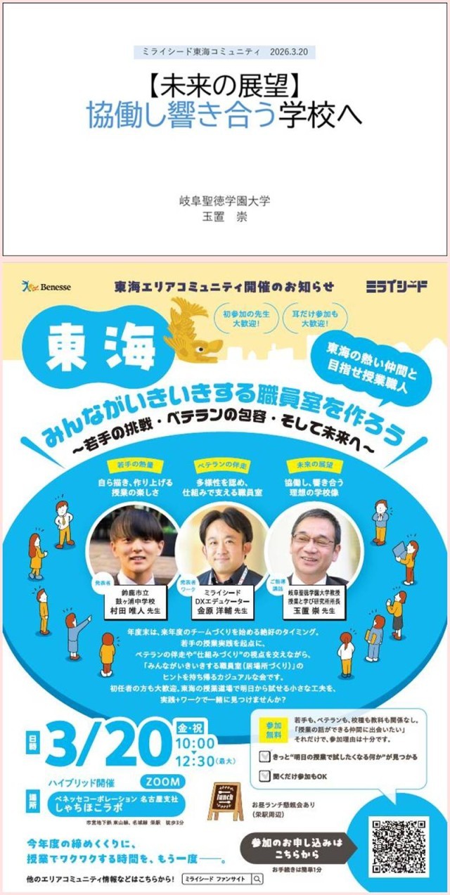 金原先生の進行で、オンラインの方も巻き込みながらのいつも以上の充実の会。村田先生の「中学校英語におけるミライシード活用事例」発表では、ミライシードのよさを踏まえた子どもたちを主体的にさせる確かな7つの実践事例紹介があった。教員1年目と聞き、さらに驚き。金原先生の「ミライシード『オクリンクプラス』を活用したベテランと若手の協働デザイン実践」も秀逸。従来の「先輩の背中を見て学ぶモデルの限界」を言及し、解決の糸口として「オクリンクプラスを共有の土台にする共創エコシステム」提案と若手が共創システムを活用して変容した事実の紹介あり。この実践も広く紹介したい!最後は僕が担当。「【未来の展望】協働し響き合う学校へ」と題して提案。響き合う学校にするには、意識して仕掛け人になる人が必要と強調。今日もお陰様で深い学びをさせていただいた。みなさんに感謝。