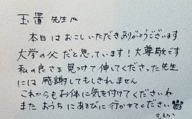 11時8分に地元駅乗車。11時45分久屋大通駅下車。迷いながらザ・フォレストオブロルドへ。今日は5期生酒井さんの結婚式に招待をいただけた。同じく5期生・Uさんを始め、本学卒業生の皆さんと披露パーティー席で同席。とりわけUさんとは酒井さんを支えるためにいろいろと相談して動いたこともあって、酒井さんの姿を見て、二人で涙。僕は胸にこみあげてくるものがいっぱいあって、感激が止まらないパティ―。