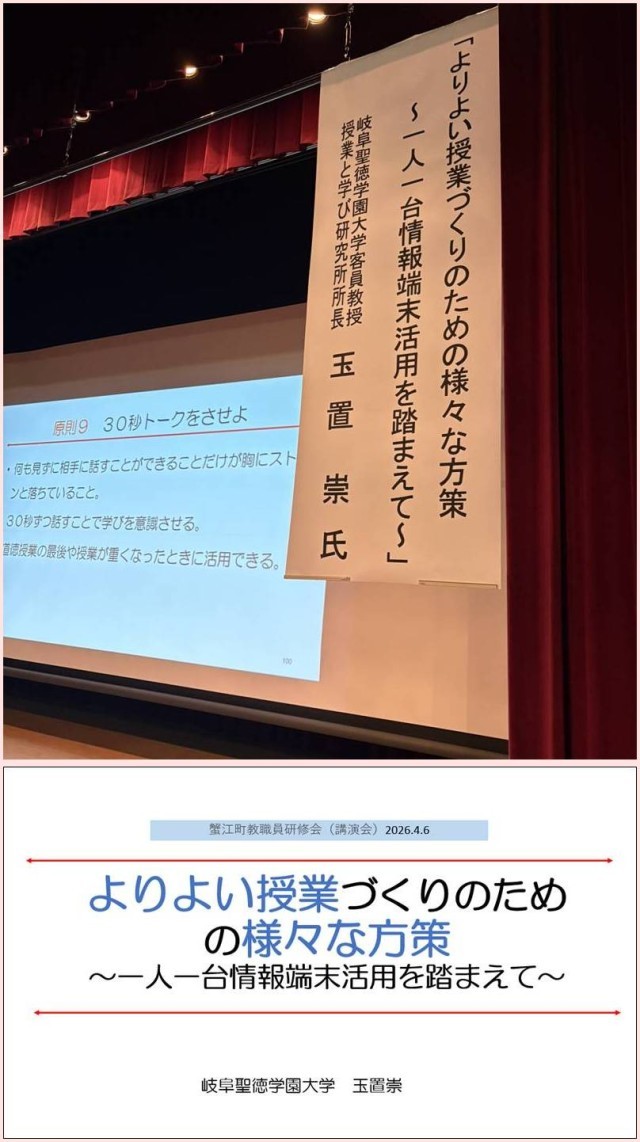 9時30分から11時まで、蟹江町内小中学校に勤める皆さんを対象とした大きな舞台での講演。演題は「よりよい授業づくりのための様々な方策~一人一台端末活用を踏まえて~」。時折、舞台から降りて、質問への回答を拾いながらの展開。一人一台端末活用の重要点は、誰一人取り残さないこと、子どもと子どもを結び付けることなどを動画も見せながら伝える。最後は若い教師を意識したワークショップ型授業技術紹介。期待に応えられた講演ができたと思う。