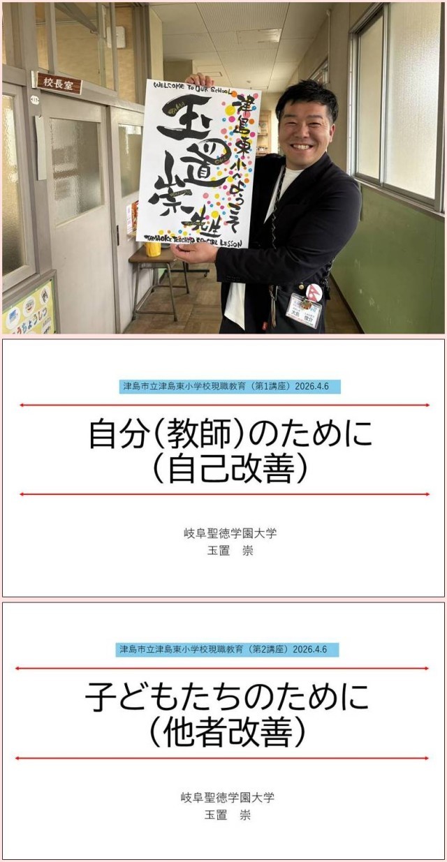 津島市立津島東小学校へ移動。浅井教育長が足を運んでいただいていた。久しぶりの再会。教育長が校長時代に何度も指導助言者として呼んでいただいたことが懐かしい。日比野校長とは野口芳宏先生つながりと言っていい。